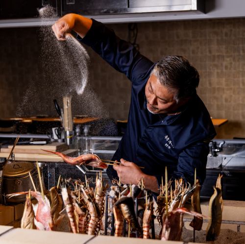 The "primitive grilling" method, where meat is slowly grilled over charcoal, is the essence of Murakiya.You can enjoy the sensation of watching the flames rise up right before your eyes and the delicious flavor of the fragrant seasonal fish with all five senses.The aroma of charcoal grilling, such as fatty fish and large shrimp, will stimulate your appetite.It also goes great with alcohol.